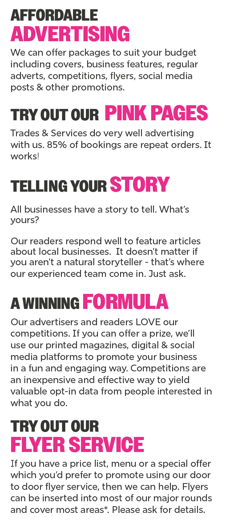 We can help you with features, competitions, events, traditional advertising, flyer distribution and socials